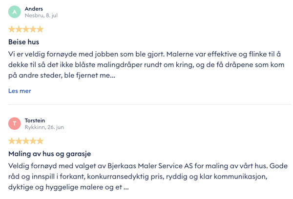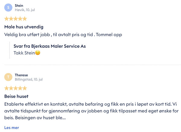 Bjerkås Maler Service har vært i virksomhet i over 30 år i Oslo. Vi betjener Oslo, Asker, Slemmestad og Bjerkås. Sjekk ut våre anmeldelser på nett her eller besøk oss på vår Mittanbud side og les noen av de over hundre anmeldelsene.